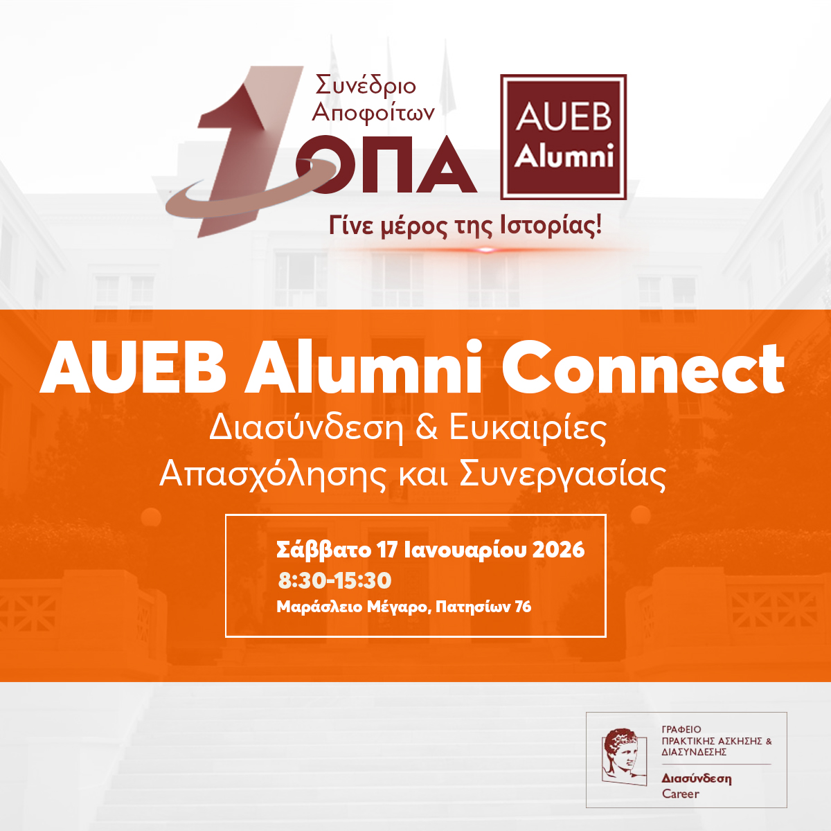 - Η δράση «AUEB Alumni Connect – Διασύνδεση & Ευκαιρίες Συνεργασίας 2026» απευθύνεται αποκλειστικά σε αποφοίτους του Οικονομικού Πανεπιστημίου Αθηνών που συμμετέχουν στο συνέδριο.